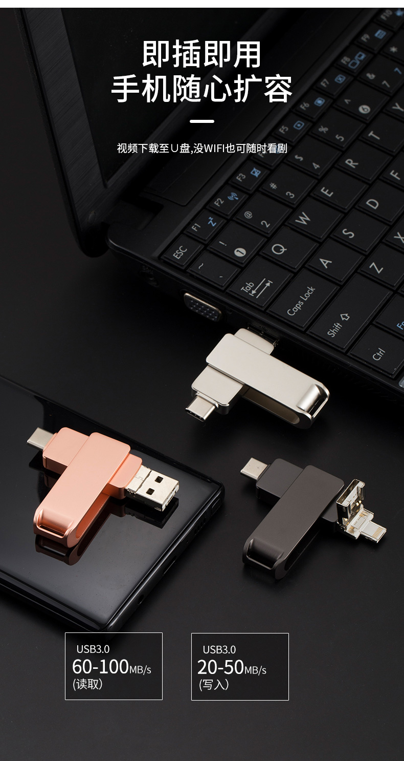 2021款最新安卓手機U盤.蘋果手機U盤.type c手機U盤 旋轉式手機電腦U盤.外觀采用金屬材質.使用非常方便推拉款式.