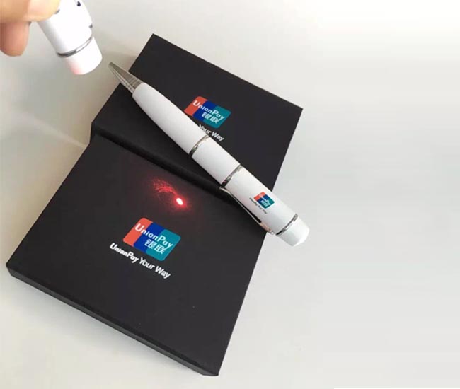 中國銀聯定做激光筆U盤禮品,定做激光筆U盤是作為中國銀聯贈送給辦理貴賓客戶,享受VIP服務頂級待遇。U盤筆最大的亮點就是,頭部有一個紅光的多媒體演示燈筆。正常情況下,它可以當作一支簽字筆,從中間部位擰開它還是個U盤,這支集2種用途于一身的U盤筆,自己用或者送人都非常不錯,是作為一款禮品U盤的不二選擇。